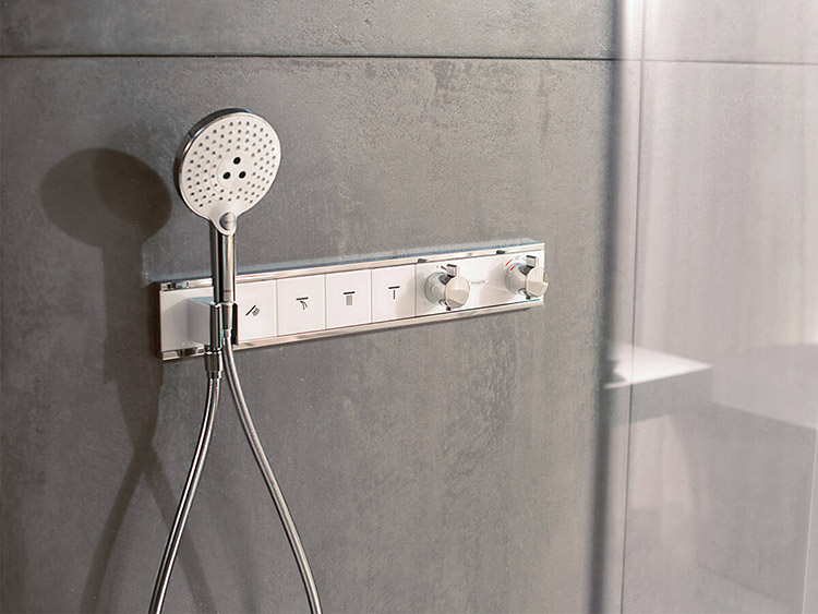 В центре внимания пространства находится зона душа вровень с полом, приглашающая расслабиться и насладиться водой. Большой верхний душ Raindance Rainfall радует роскошным дождевым душем.